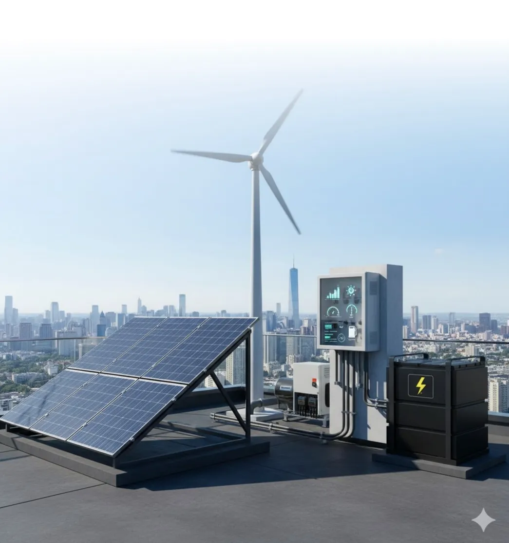 A combining solar, wind, and backup generator technologies to ensure a sustainable and continuous energy supply.